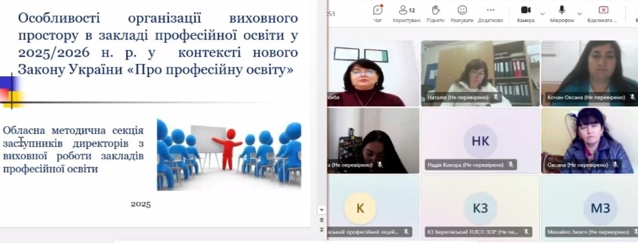 23 жовтня 2025 року відбулося засідання обласної методичної секції заступників директорів з виховної роботи закладів професійної освіти області в режимі онлайн. Керівник секції Ірина Ладижець ознайомила присутніх з особливостями планування виховної роботи у закладах професійної освіти на 2025/2026 навчальний рік в умовах викликів сьогодення, окреслила основні орієнтири виховної діяльності в ЗПО, говорила про сучасні підходи до планування виховної роботи, знайомила з методичними рекомендаціями, законодавчими змінами та новими формами виховної діяльності у закладах професійної освіти.